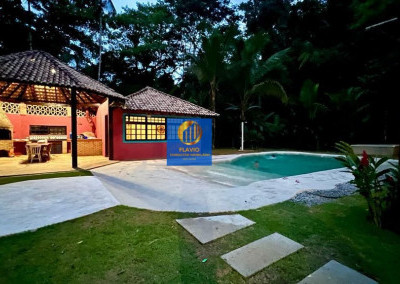 Área gourmet com churrasqueira, fogão a lenha, forno a lenha e salão de jogos com banheiro Piscina estilo praia, algumas frutas no terreno. Mais casa de caseira